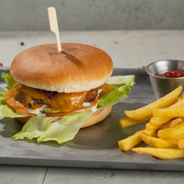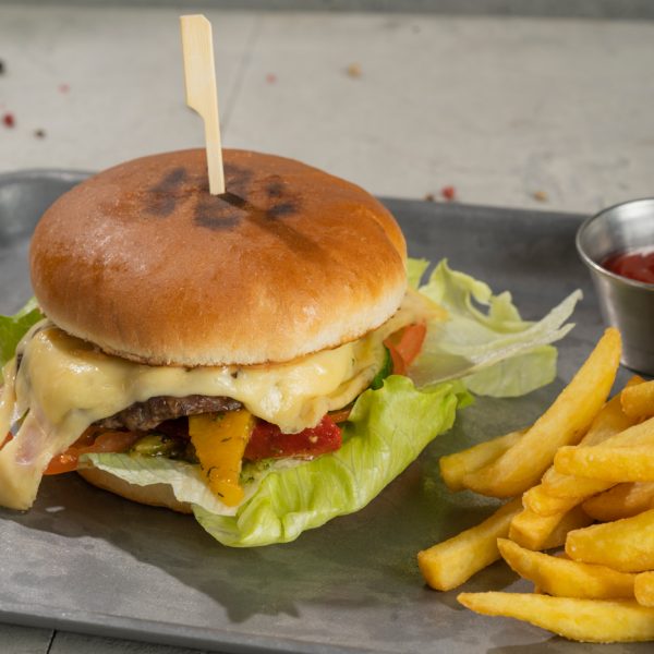 Brioche sai, veiselihapihv, Emmentali juust, jäämägi salat, kergelt soolatud kurk, värsked tomatid, küpsetatud paprika, praetud sibul, friikartulid, kreemjas BBQ-kaste, ketšup.