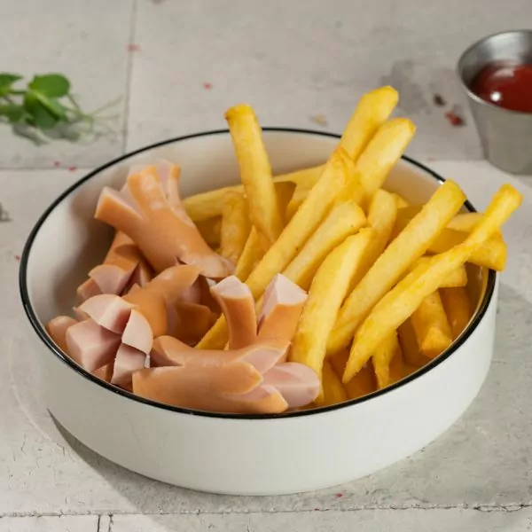 Keedetud või grillitud vorstid, friikartulid, ketšup.