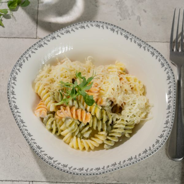 Värvilised makaronid, mozzarella juust, koor, või, roheline.