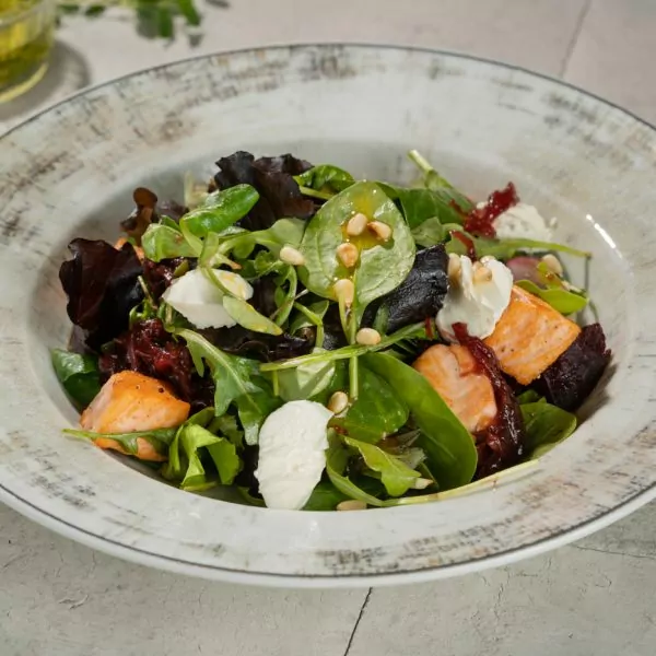 Lõhe, salatisegu, viinamari, röstitud peet, toorjuust, sibulamarmelaad, Aasia kaste, seedermänniseemned, münt.
