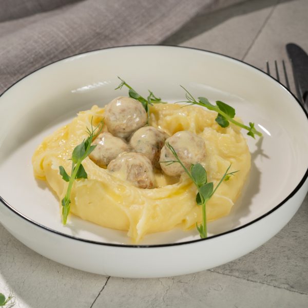 Kanakoiva ja -rinnafilee lihapallid, või, muna, koor, roheline sibul.