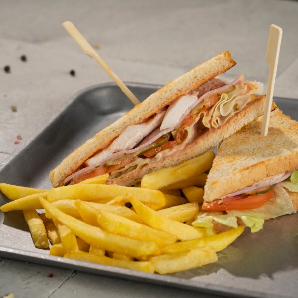 Röstitud sai, kanafilee, sink, salatileht, värsked tomatid, kornišonid, friikartulid, roosa kaste.