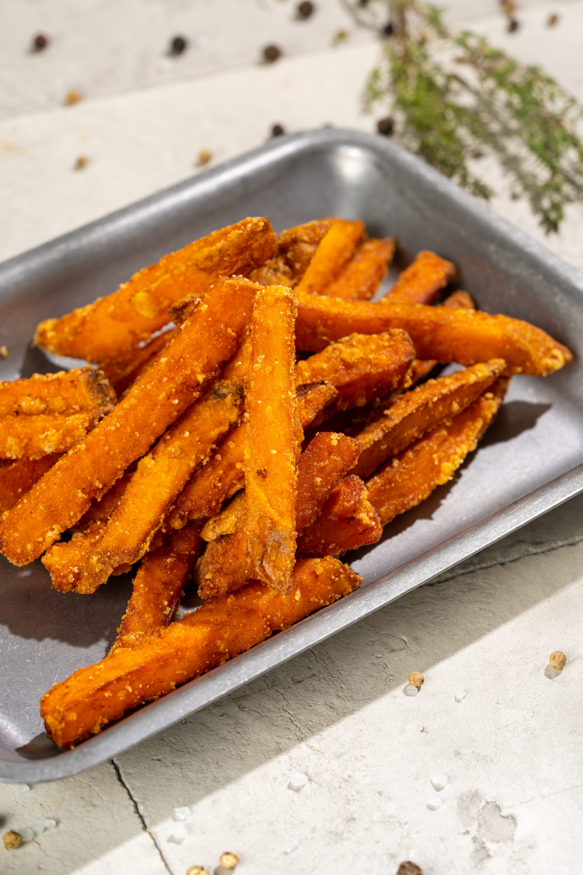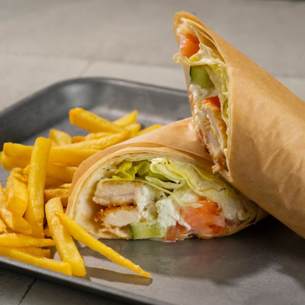Krõbe paneeritud kana, feta juust, jäämarja salat, tomatid, kurk, lavaš, tartarkaste, friikartulid.