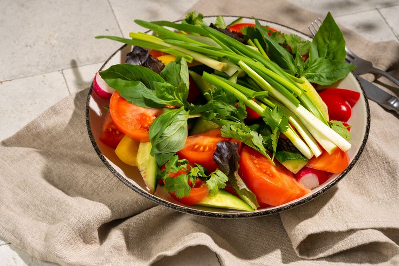 Kurk, tomatid, paprika, redis, roheline sibul, basiilik.