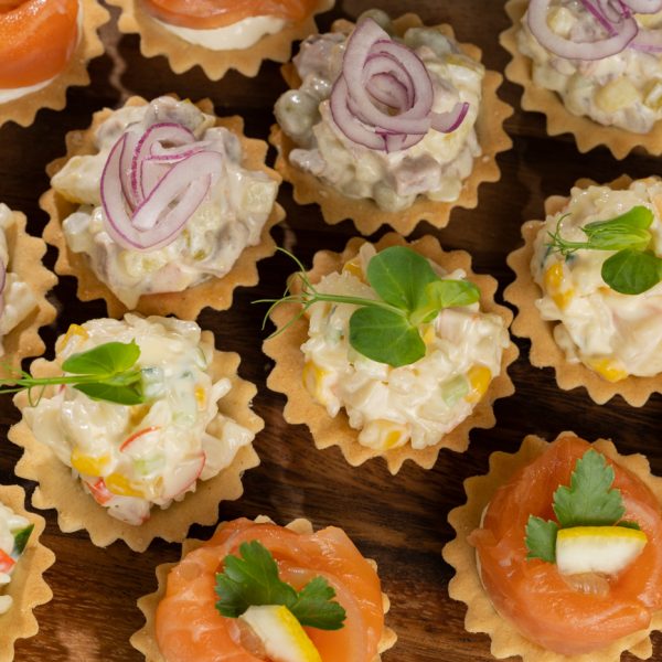 Tartalett, kanafilee, porgand, marineeritud kurk, konserveeritud herned, kartul, punane sibul, majonees, kanamuna, maitseroheline.