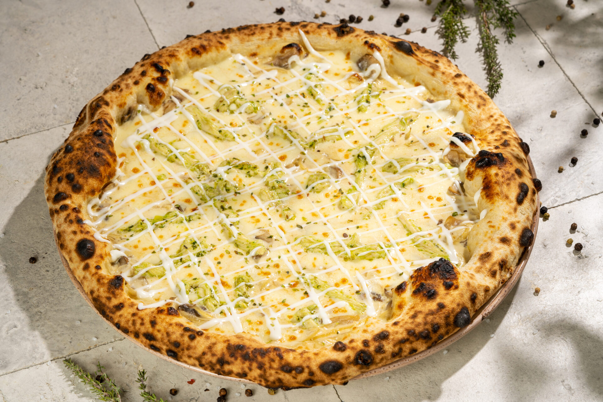 Põhi, julienne-kreemkaste, mozzarella juust, kanafilee, oregano.