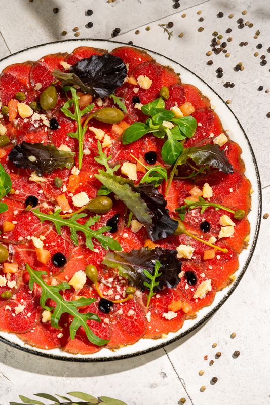 Veiseliha sisefilee, tomatid, salati segu, parmesani juust, kaprid, balsamico kreem.