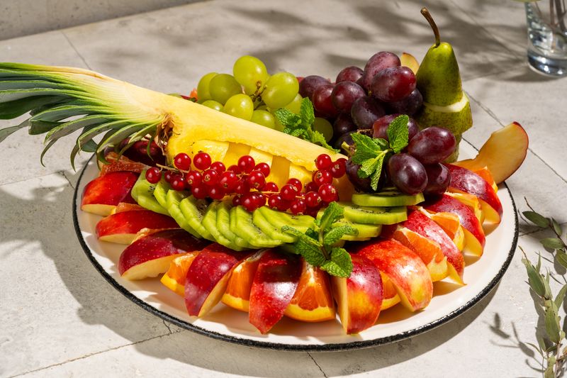 Õun, pirn, apelsin, viinamarjad, ananass, kiivi, marjad.