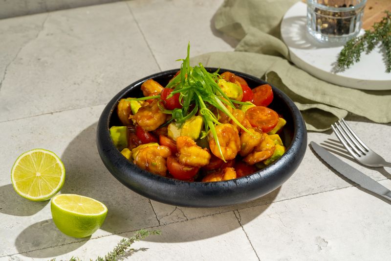 Tiigerkrevetid, avokaado, kirsstomatid, sibullehe, ingverikaste.