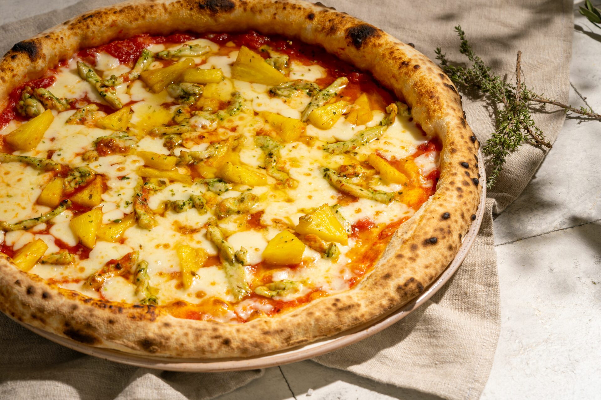 Põhi, tomatikaste, mozzarella juust, kanafilee, ananass, oregano, oliiviõli.
