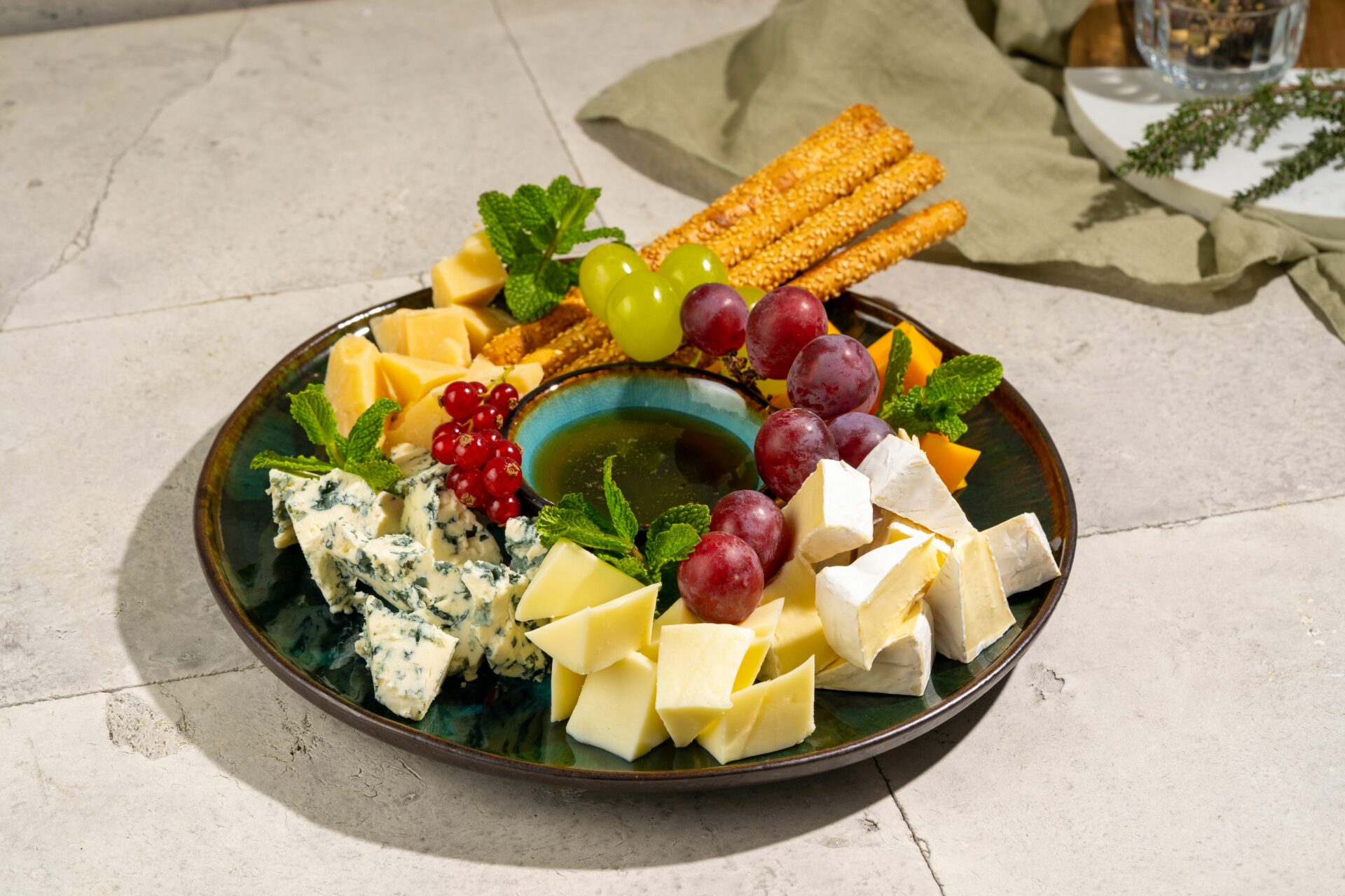 Cheddari juust, Mozzarella juust, Dorblu juust, Parmesani juust, Camemberti juust, krõbedad pulgad, mesi, marjad.