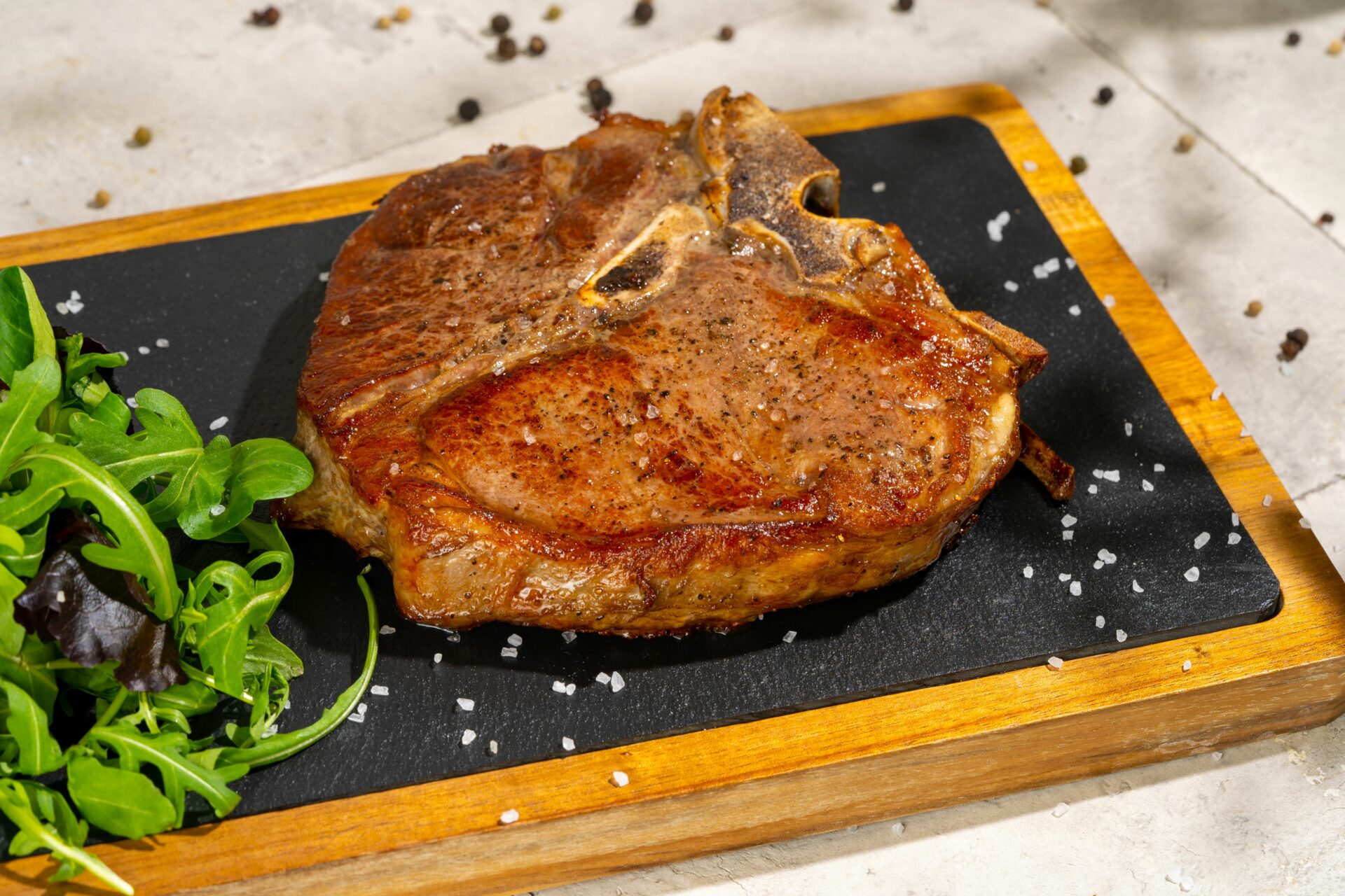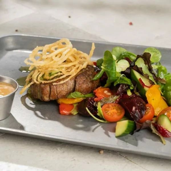Veise sisefilee, salatisegu, küpsetatud paprika, küpsetatud peet, tsitrusekaste, roheline küüslauguõli, sibulamarmelaad, friteeritud sibul, vähesoolane kurk, piprakaste, rosmariin, vürtsid.