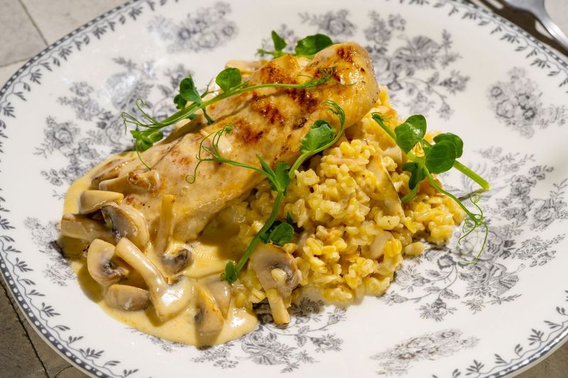 Kanafilee, šalottsibul, šampinjonid, küüslauk, koor, või, bulgur.