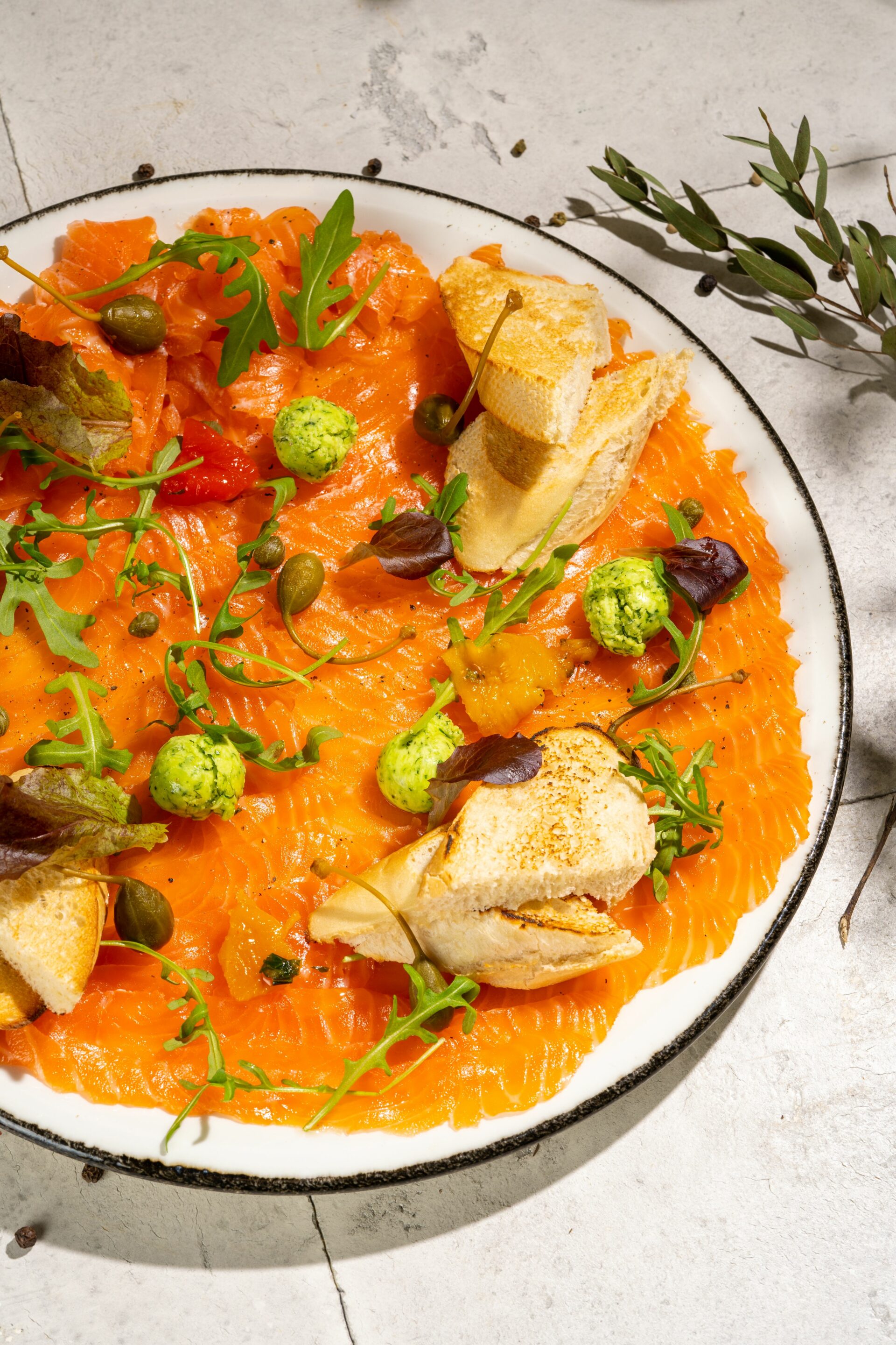 Kergelt soolatud lõhe, kaparid, salatisegu, rohelise küüslaugu ja ürtidega õli, baguette, röstitud paprika.