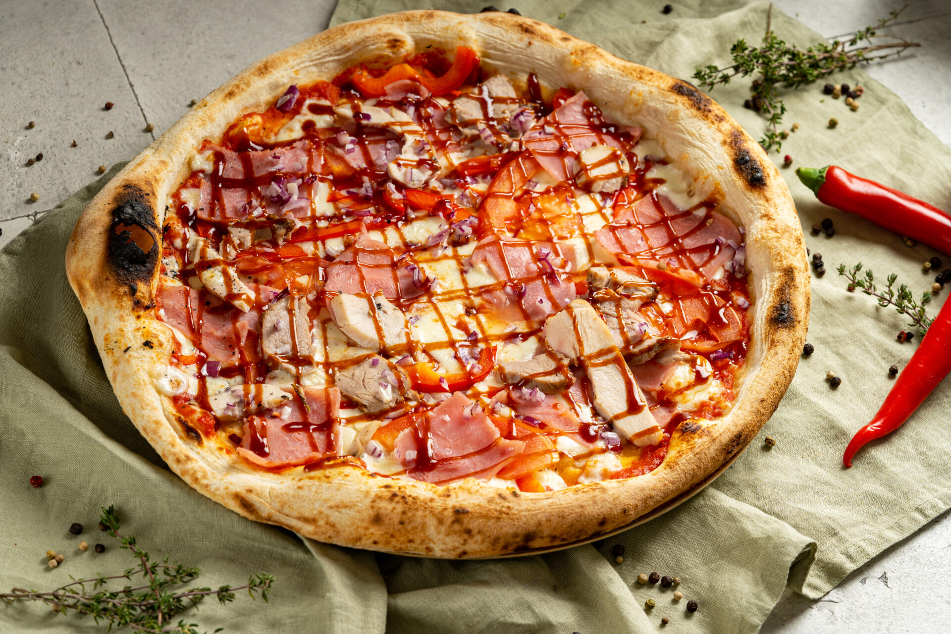 Tainapõhi, tomatikaste, mozzarella juust, kanarind, seafilee, sink, paprika, punane sibul, värsked tomatid, BBQ kaste, oliiviõli, oregano.