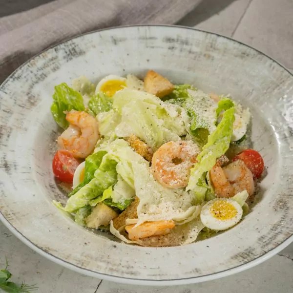 Jäävõi salat, rooma salat, tiigerkrevettid, kodused krutonid, parmesani juust, kirsitomatid, vutimunad, caesari kaste.