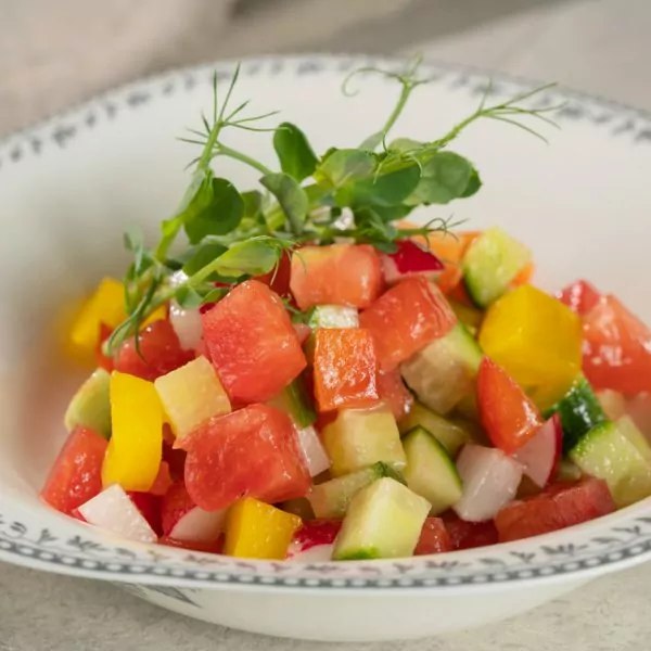 Värske kurk, värsked tomatid, paprika, redis, roheline. Kaste valikul: hapukoor, õli.