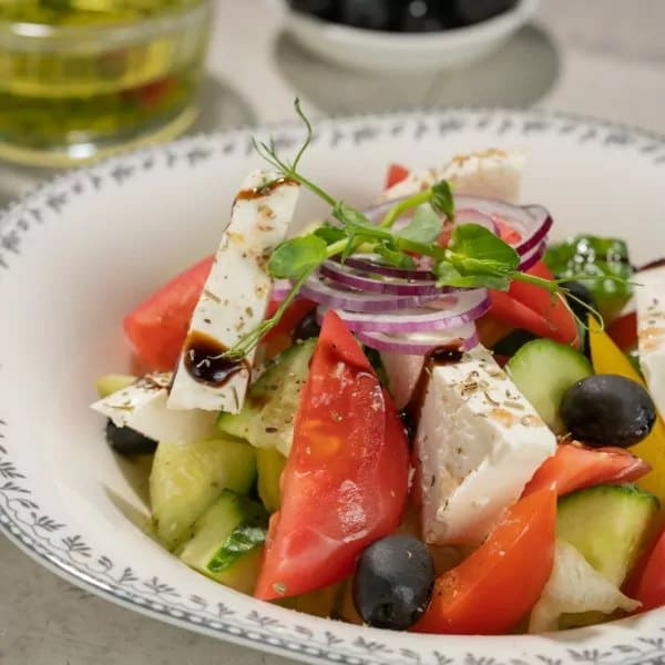 Värsked tomatid, värsked kurgid, paprika, jäävärk-salat, oliivid, punane sibul, feta juust, kreeka kaste.