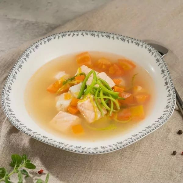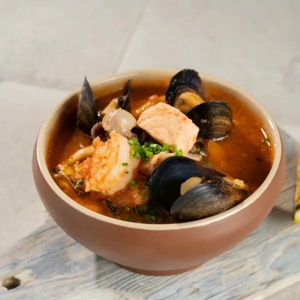 Kalapuljong, lõhe, kalmaar, rannakarbid, tiigerkrevett, kaheksajalg, murulauk, sellerilehed, küüslauk, tomatid, ürdid.