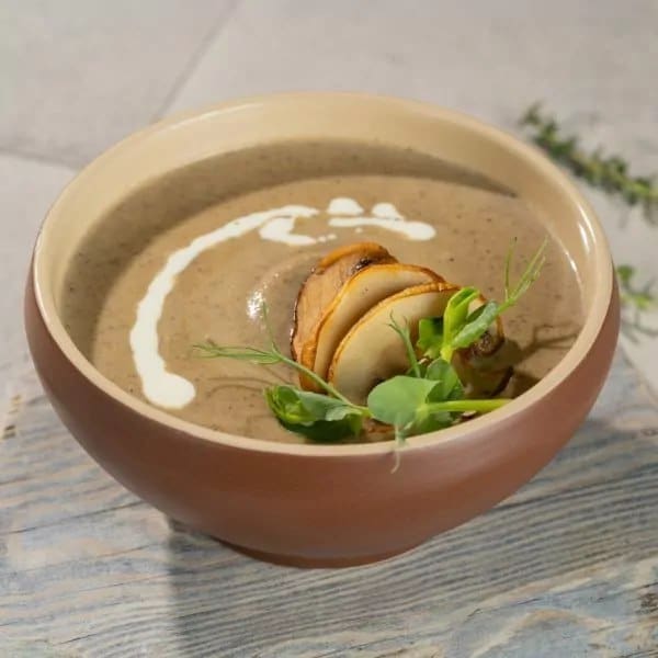 Puravikud, šampinjonid, kartul, kodused krutoonid, koor, oliiviõli, ürdid.