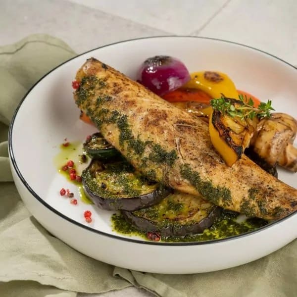 Makrell, baklažaan, suvikõrvits, paprika, punane sibul, šampinjonid, värsked tomatid, oregano, tüümian, sidrun, pestokaste, roheline.