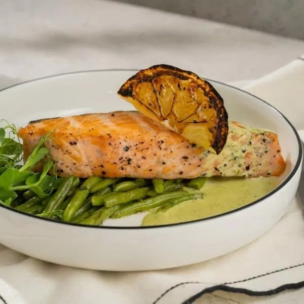 Lõhe, rohelised oad, münt, küüslauk, või, kreemjas-basiilikukaste, sidrun, vürtsid, roheline.
