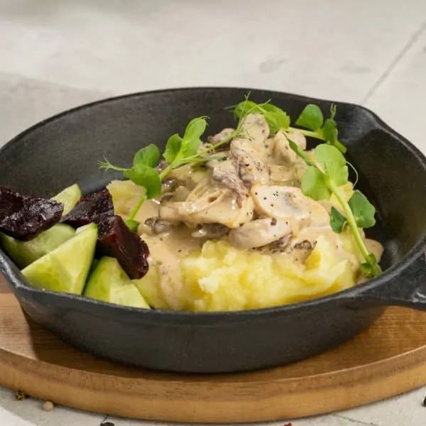 Veise sisefilee, šampinjonid, koor, sibul, vähesoolane kurk, küpsetatud peet, kartulipüree, rohelised.