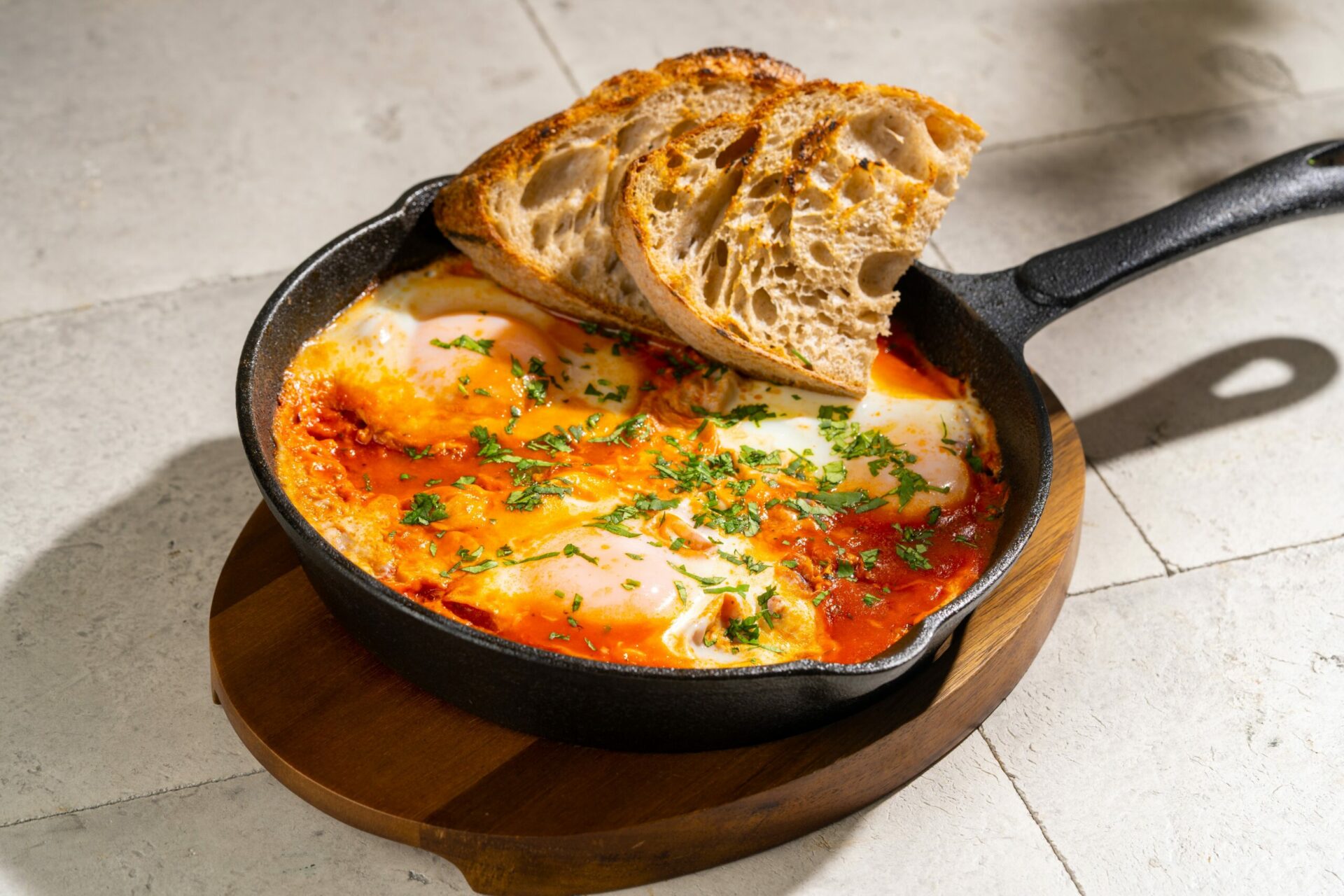 Baguett, kreemjas kaste, Parma sink, kirsstomatid, ürdid.