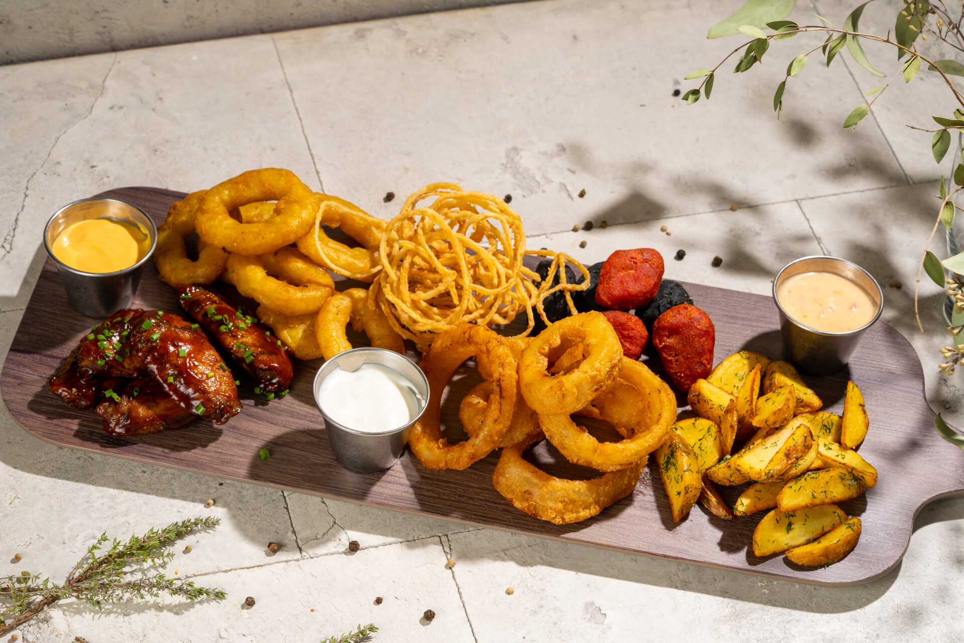 Куриные крылышки BBQ, картофельные дольки, сырные наггетсы, луковые кольца, кальмаровые кольца, лук фри, сырный соус, чесночный соус, соус хабанера.