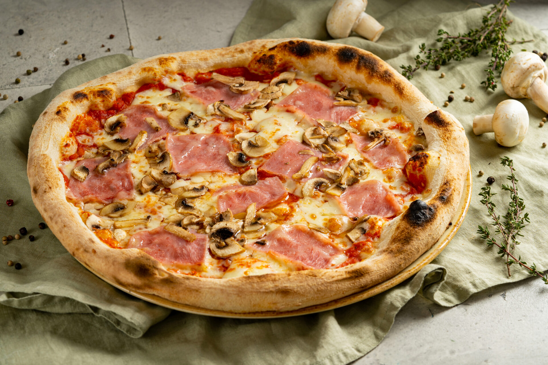 Тесто основа, соус томатный, сыр моцарелла, ветчина, шампиньоны, оливковое масло, орегано.