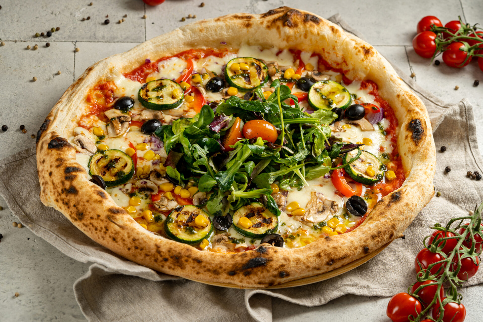 Тесто основа, соус томатный, сыр моцарелла, цуккини, шампиньоны, микс салата, томаты черри, болгарский перец, маслины, кукуруза консервированная, соус песто, оливковое масло, орегано.
