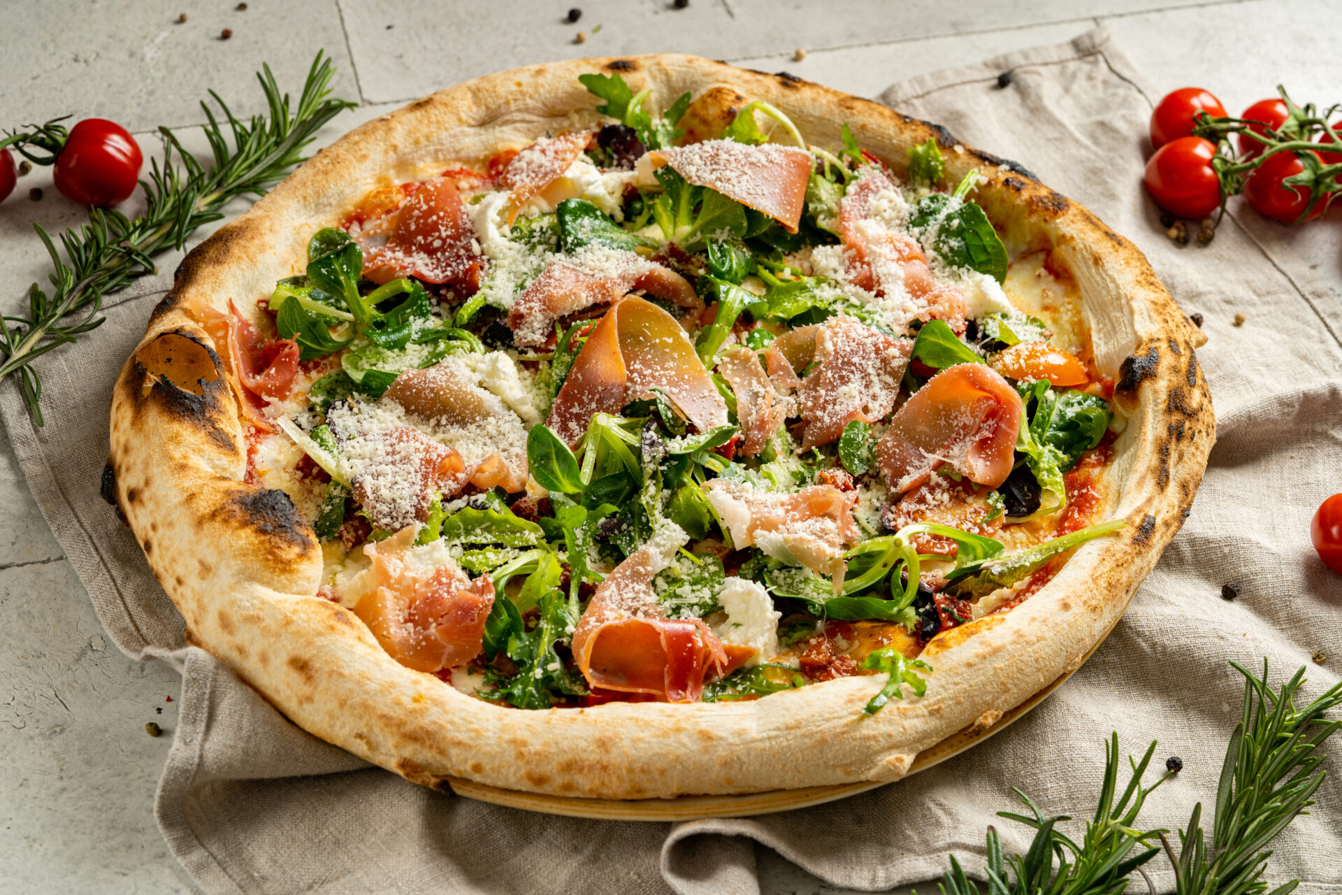Тесто основа, соус томатный, сыр моцарелла, пармская ветчина, моцарелла буффало, пармезан, томаты вяленые, микс салата, томаты черри, оливковое масло, орегано.