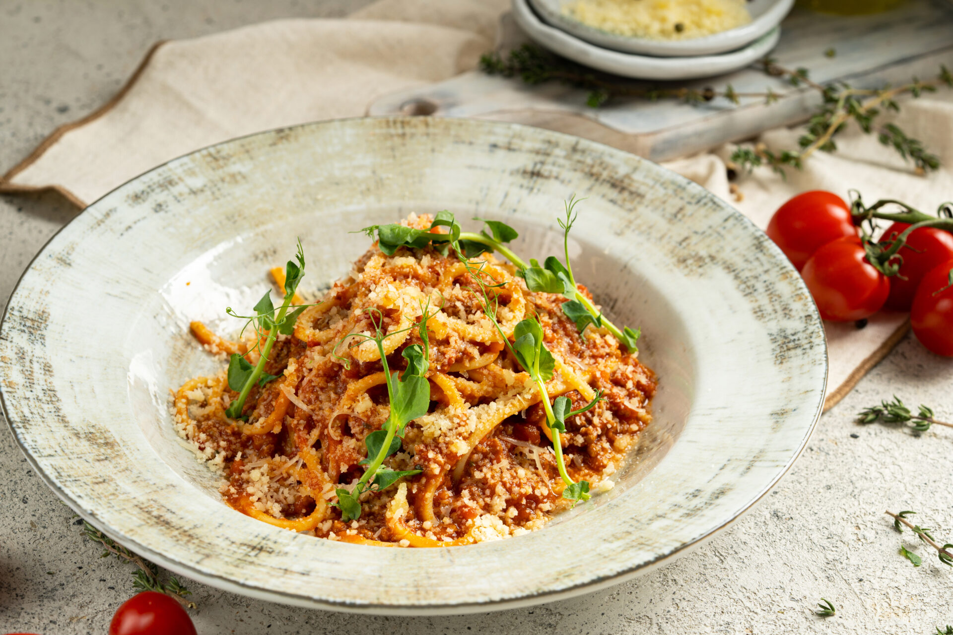 Паста, томаты, говядина, морковь, лук репчатый, корень сельдерея, соус томатный, пармезан, орегано, зелень, чеснок, соль, перец.