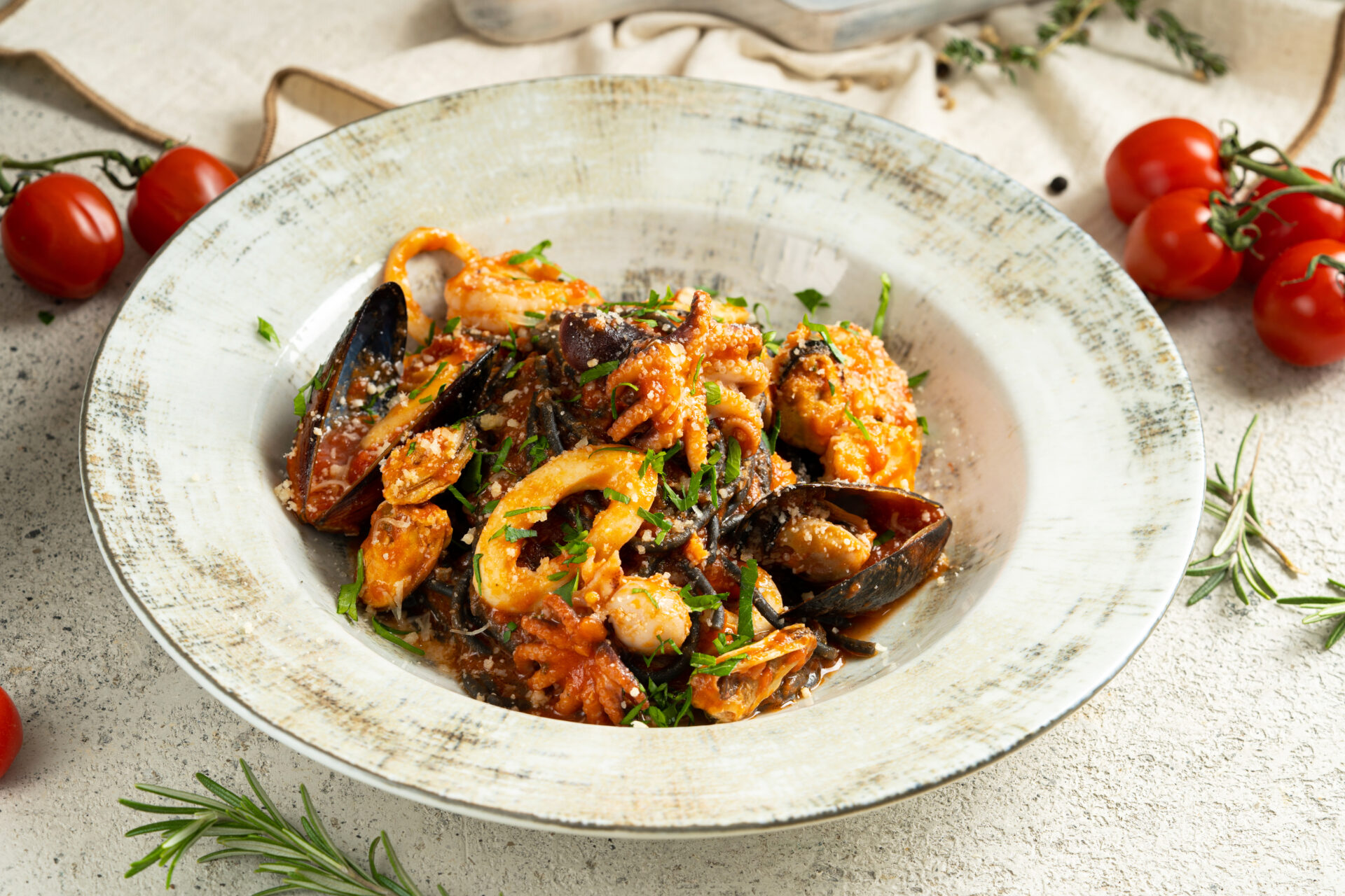 Паста, морепродукты, лосось, соус томатный, лук репчатый, чеснок, пармезан, бульон рыбный, размарин, тимьян, зелень, соль, перец.