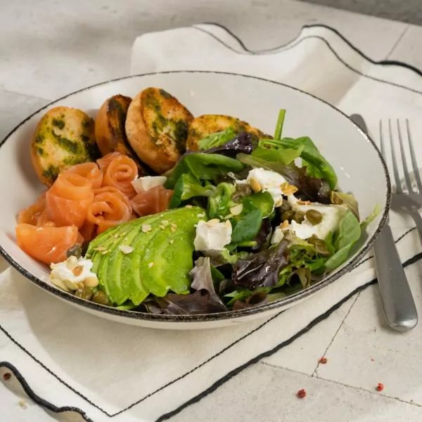Слабосоленый лосось, булочка, микс салата, соус песто, сыр сливочный, каперсы, лимон, авокадо, масло оливковое, тыквенные семечки.