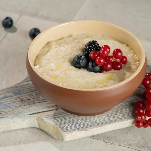 Овсяные хлопья, молоко, масло сливочное, сахар, ягоды, мята.