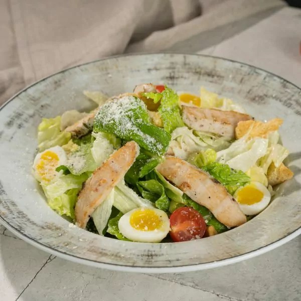 Салат айсберг, римский салат, куриное филе, сухарики домашние, сыр пармезан, томаты черри, яйцо перепелинное, соус цезарь.