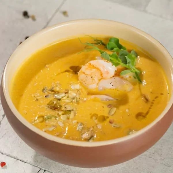 Тыква, тигровые креветки, лук репчатый, картофель, морковь, сливки, масло оливковое, домашние сухарики, тыквенные семечки, зелень.