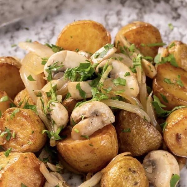Картофель, шампиньоны, лук репчатый, масло растительное, зелень.