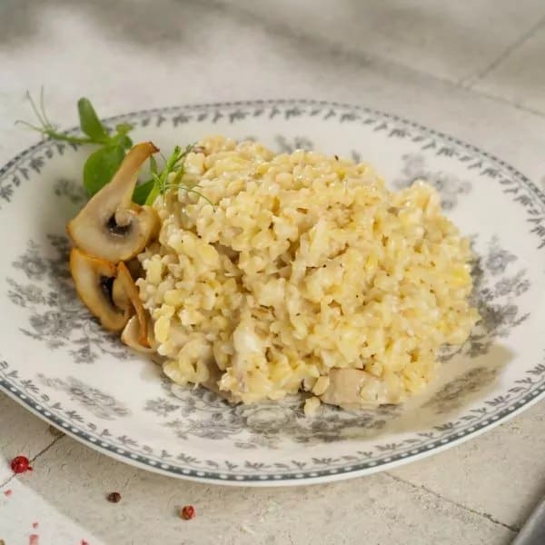 Булгур, лук шалот, сливки, шампиньоны, пармезан, соль, перец, чеснок, зелень.