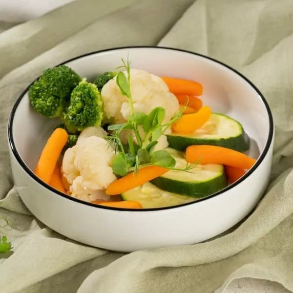 Брокколи, цветная капуста, беби-морковь, цуккини, соль, перец, зелень.