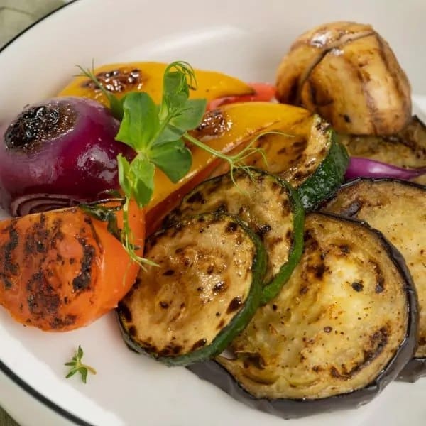 Томат, баклажан, цуккини, лук красный, шампиньон, чеснок, орегано, размарин, перец, соль.