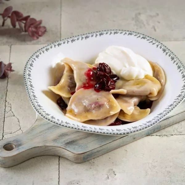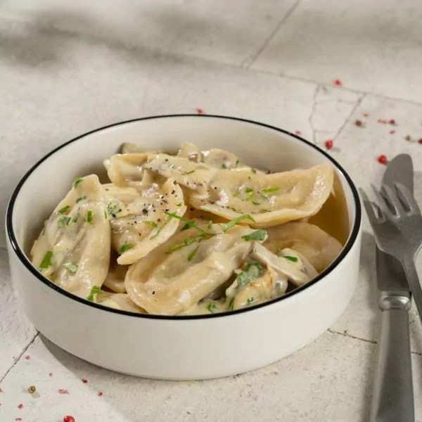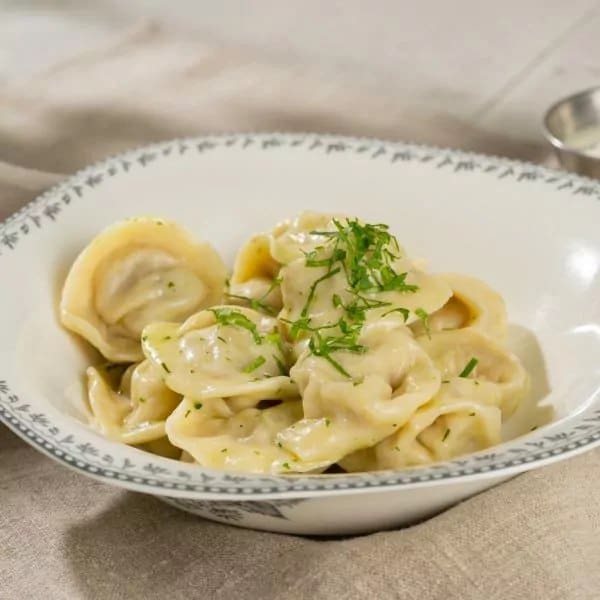 Тесто домашнее, говядина, свинина, специи, лук репчатый, зелень, сметана, зеленое масло, чеснок. Подаются с бульоном или без бульона.