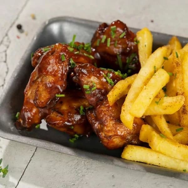Куриные крылышки, соус BBQ, картофель фри, лук шнит, специи.