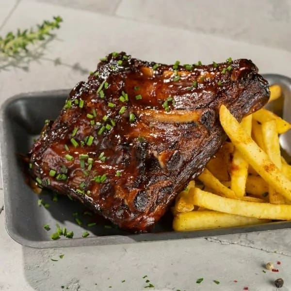 Свиные ребра, соус BBQ, картофель фри, лук шнит, специи.