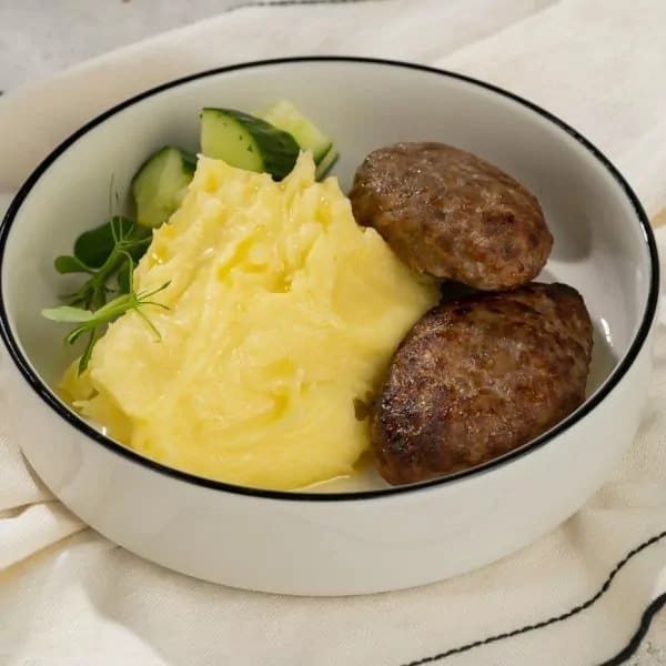 Говядина, свинина, куриное яйцо, соль, перец, картофельное пюре, масло сливочное, зелень.