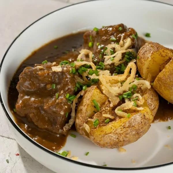 Говяжьи щечки, печеный картофель, морковь, лук репчатый, чеснок, тимьян, специи, масло сливочное, лук фри, лук шнит.
