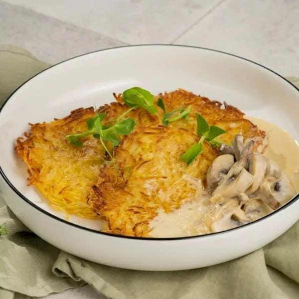 Говяжья вырезка, шампиньоны, сливки, лук репчатый, малосольный огурец, запеченная свекла, картофельное пюре, зелень.