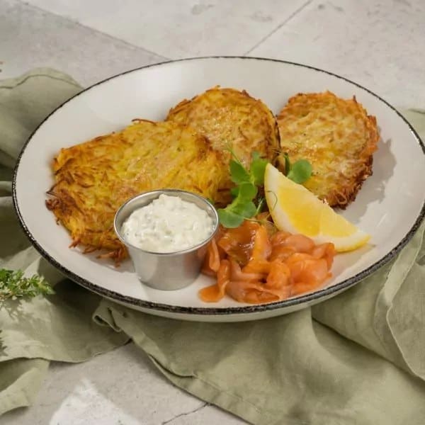 Картофель, куриное яйцо, лук, малосольный лосось, лимон, зелень, соус тар-тар.
