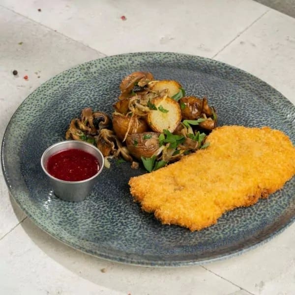 Свиная вырезка, льезон, сухари панко, картофель, шампиньоны, лук репчатый, соус брусничный, специи, зелень.